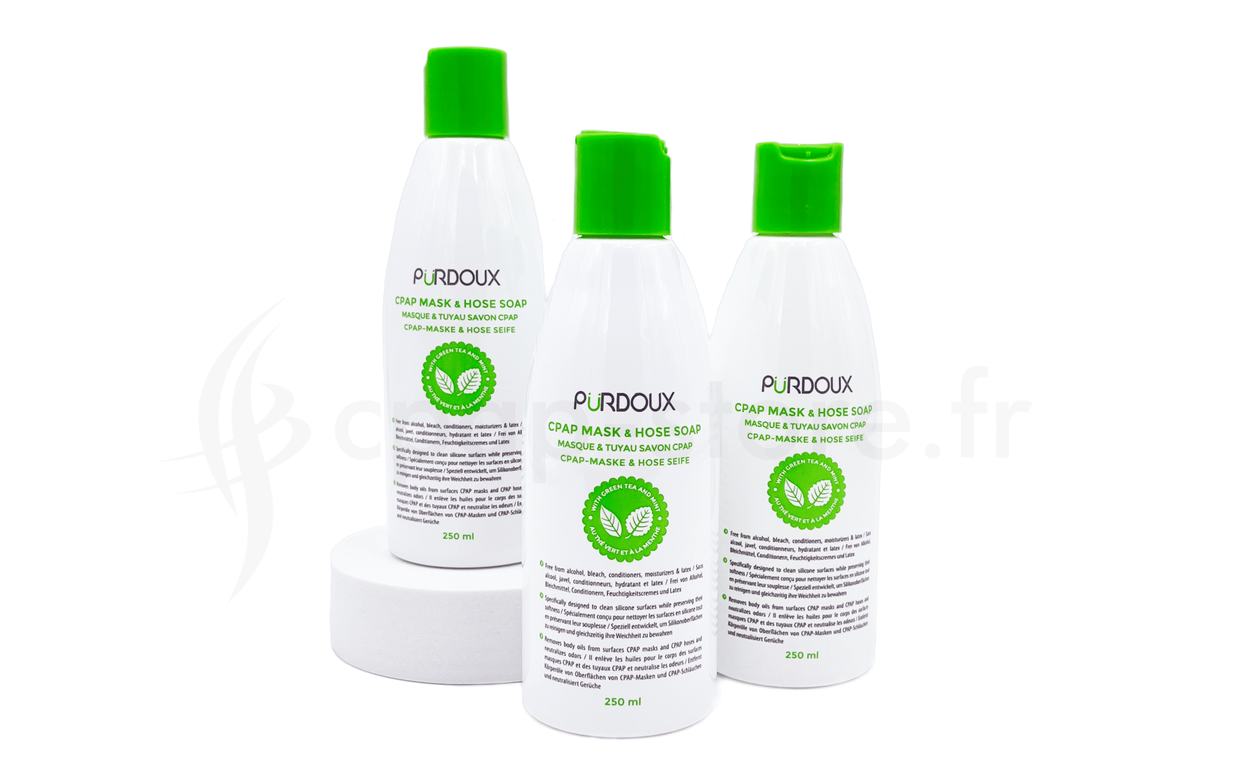 Ce savon doux au thé vert et à la menthe est spécialement conçu pour un lavage quotidien de votre masque et de votre tuyau