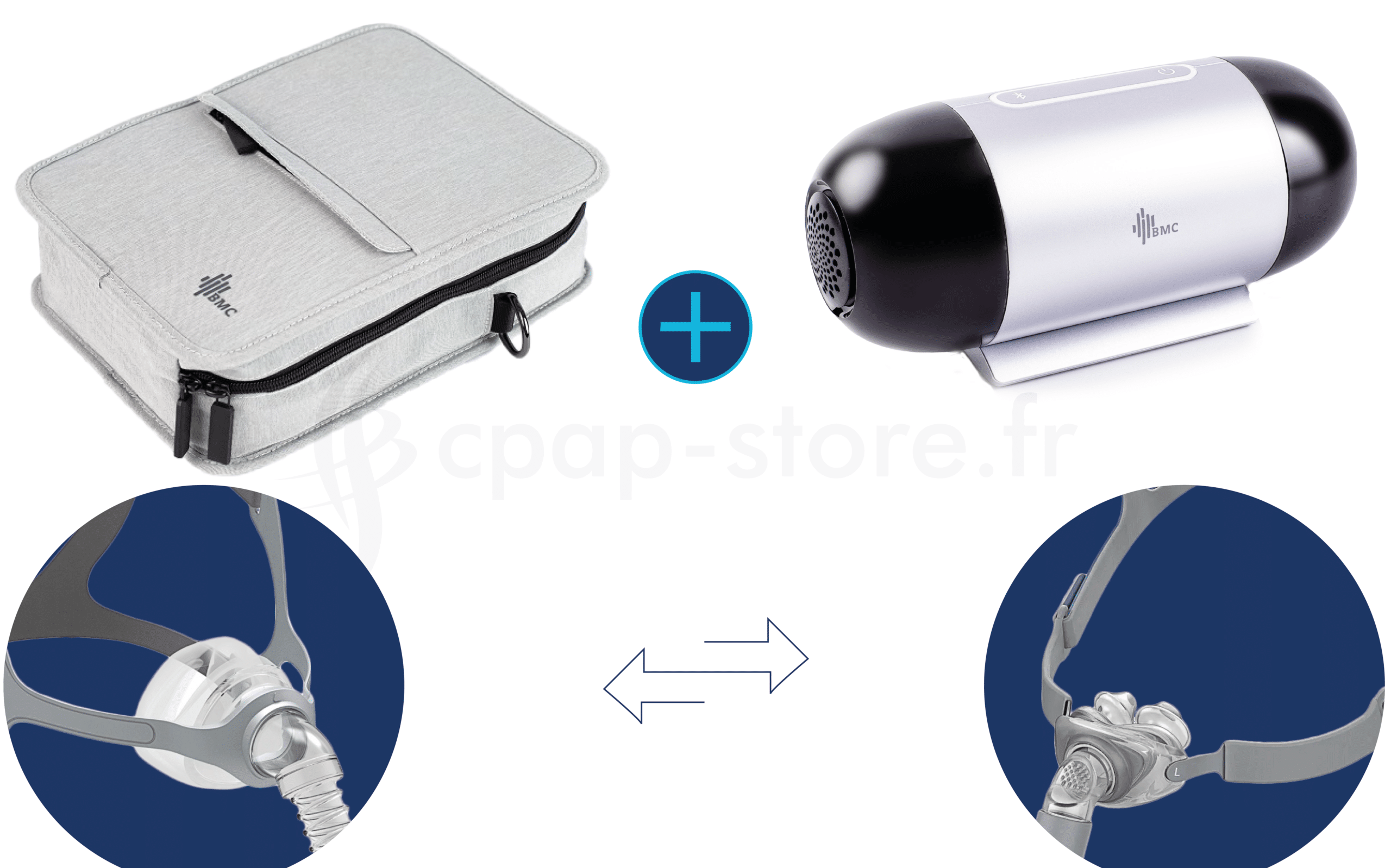 Accueil Boutique Apnée du sommeil CPAP / PPC PPC de voyage Pack de voyage complet – BMC M1 Mini + Masque + Humidificateur